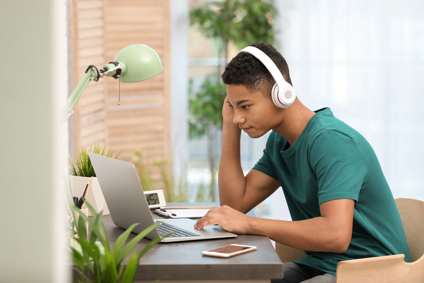 African-American teenage boy with headphones using laptop at table in room