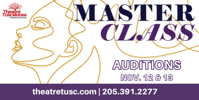 October 30, 2024 – Theatre Tuscaloosa will hold open auditions for “Master Class” Nov. 12 and 13 at 6:30 p.m. in the Alabama Power Recital Hall on the Martin