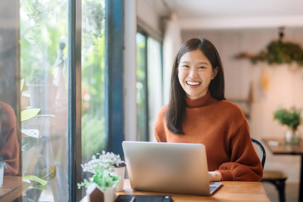 Happy young Asian girl working at a coffee shop with a laptop