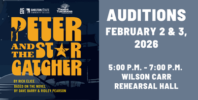 February 2, 2026 – Shelton State will hold open auditions for Peter and the Starcatcher February 2 and 3 from 5:00 p.m. until 7:00 p.m. in the Wilson Carr Rehearsal Hall on the Martin Campus of Shelton State Community College (9500 Old Greensboro Road, Tuscaloosa, AL 35405).