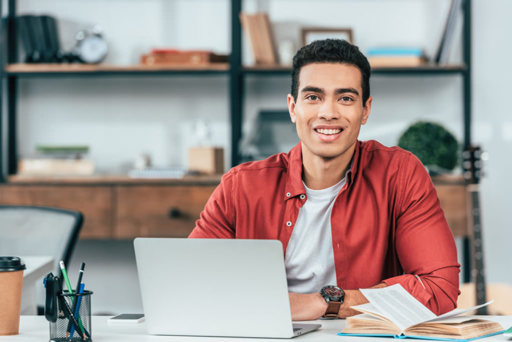 Smiling student in red shirt sitting at table and using laptop